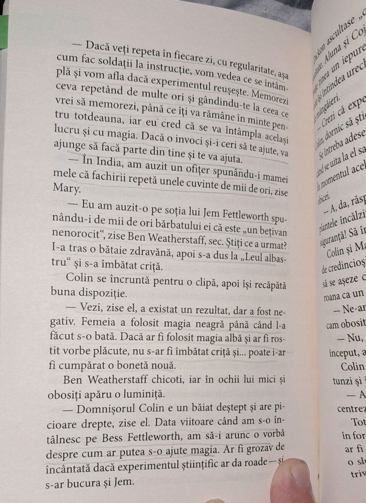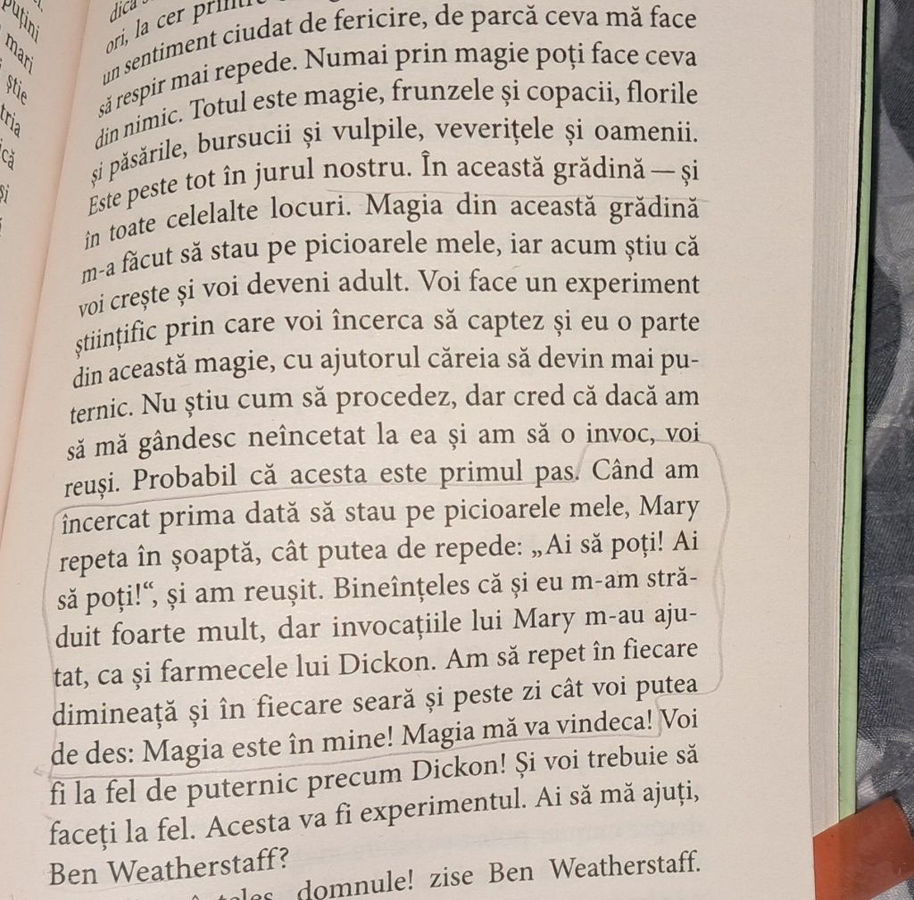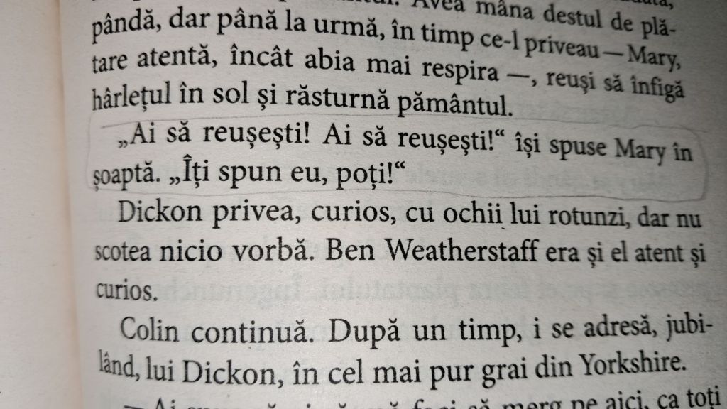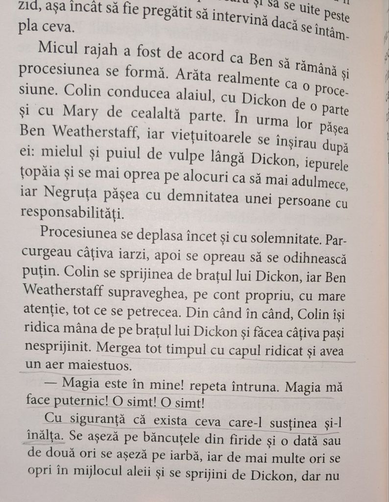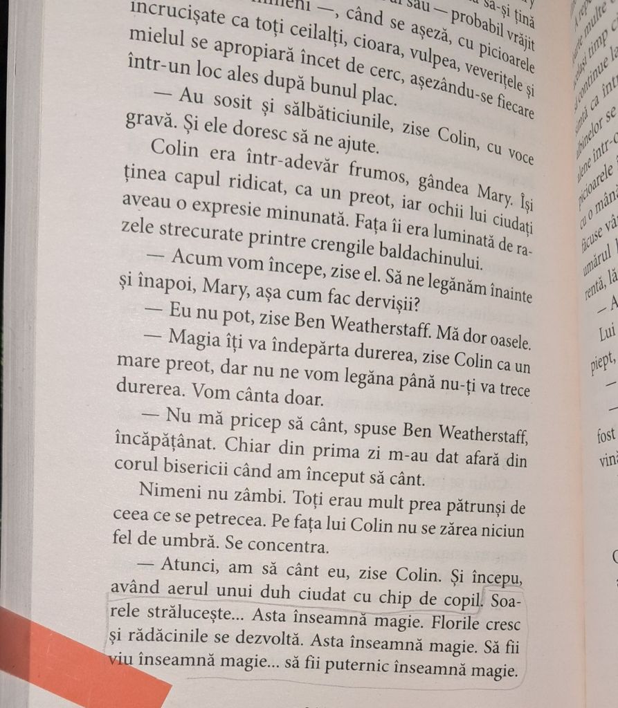 Am fost uimită să găsesc aici în această carte pentru copii câteva pagini despre puterea încrederii în sine, a autosugestiei, legea atracției cum i se mai spune în „dezvoltarea personala”. Magia care zace în noi se pare. Magia care a făcut ca grădina să prindă viață, Colin să poată merge și să fie sănătos, iar tatăl lui să revină acasă.