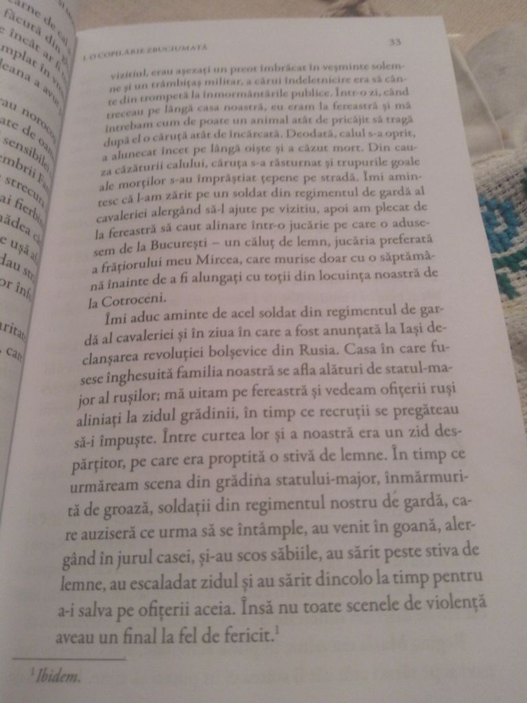 Aș reciti oricând această carte. Mi-a plăcut foarte mult. Plină de informații interesante precum cea despre actualul palat Cotroceni, așezat pe locul unei vechi mănăstiri, a fost decorat după gustul și alegerea Reginei Maria. Acesteia nu i-au plăcut încăperile palatului regal din centrul orașului. Culmea este că palatul Cotroceni este menționat ca fiind situat la marginea Bucureștiului. Aș fi curioasă de cum arăta atunci harta capitalei, căci clar acum în zilele noastre acesta se află situat chiar în inima urbei.